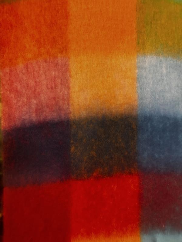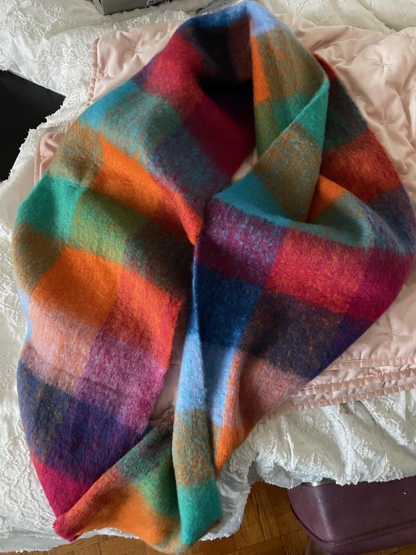 This scarf has a soft feel, smooth texture, and vibrant colors. It's large enough to wear as a wrap.
