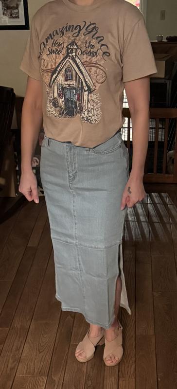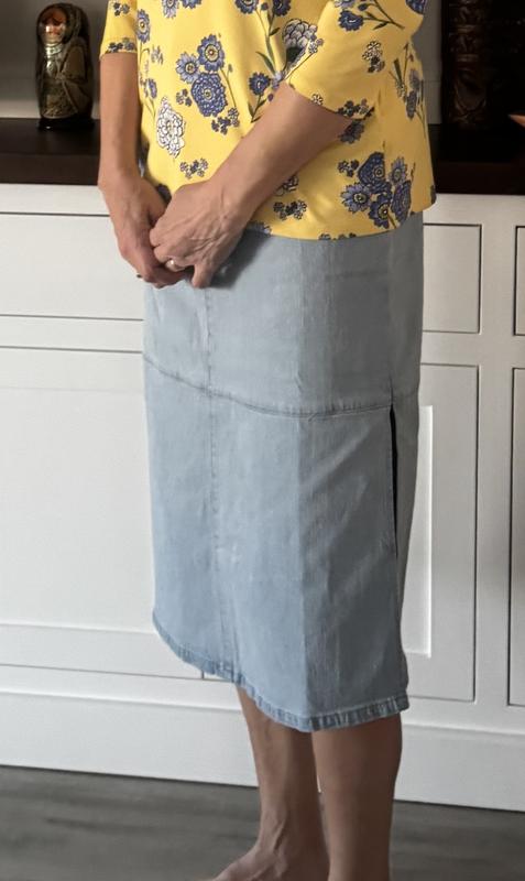 Since I'm older, I prefer wearing midi or at least knee-length denim skirts, but I find they either look frumpy (midi) or are pencil style (knee-length) and too tight-fitting for work. (I'm a teacher.) This is perfect--the side slits make it easy to walk in and keep it from looking frumpy despite the longer length. Also, because I have an hourglass shape, a lot of skirts with stretch are slightly tootight in the hips for me while also too big in the waist, but in this skirt my usual size 8 fits perfectly. (For reference I'm 5'6", about 140-145 pounds, 28"-29" waist, with some flab, and about 38" hips.) I will definitely be getting a lot of wear out of this.
