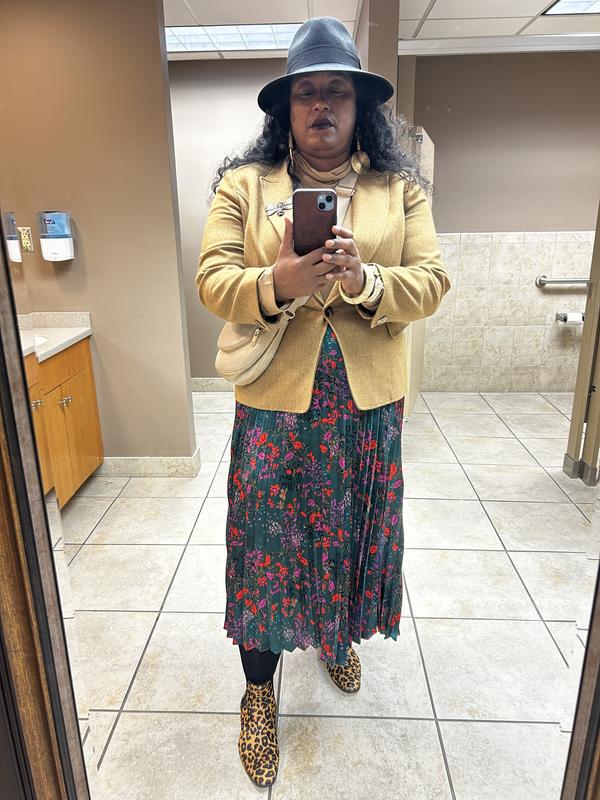 This is a beautiful and versatile skirt. So colorful, to pair with dressy blouses and heels or sweaters and boots. It absolutely does not wrinkle which is a nice plus.