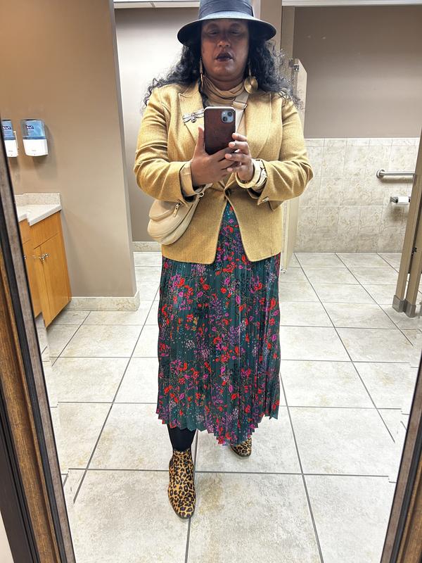 A really beautiful find at the great Macy's price. The skirt is gorgeo It hides problems at the waist distracting with an amazing deep green stylish fabric.