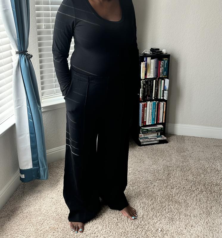Comfortable fitting yet looks dressy. The wide leg is wide! The leg length is long. I’m 5’*’ and need to wear a 2 inch heel for pants to not be on the floor. I really like the comfort and look. Can be dressed up or down.