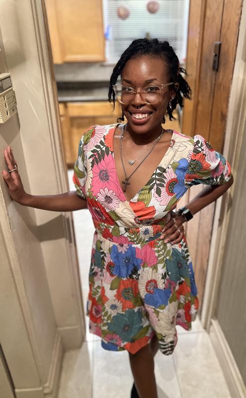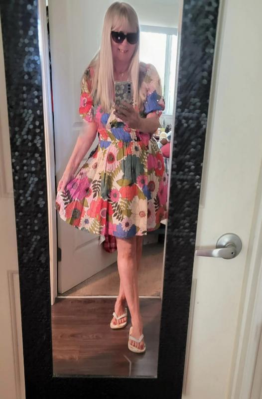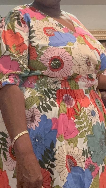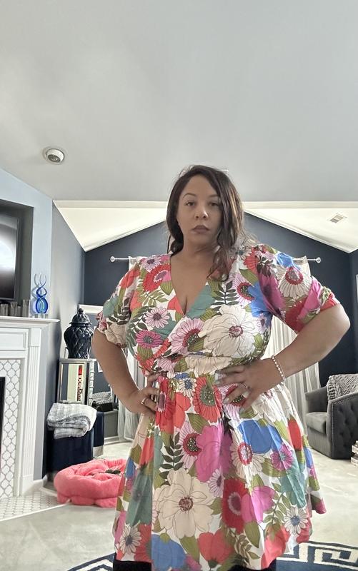 It’s a cute dress but not for me , just does nothing for me , looks frumpy, it’s made more for a taller person with no hips , I am small 5’3 118 dress comes below my knees at a unflattering length , fabric is nice though and soft colors are a little washed out ,