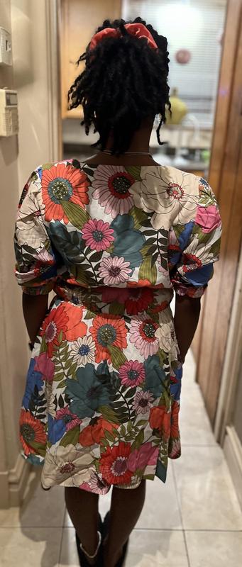 This dress looks so cute online, but the actual product is not that cute. There's a wide waistline band that would be perfect if it cinched flat against the body, but it poofs out, making it look strange and like you're hiding some fat in there. No bueno. The print is nice, and the material is more stiff cotton, but I'm not sure how it would launder because I sent it right back.