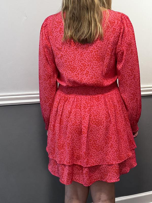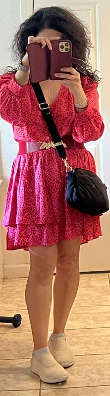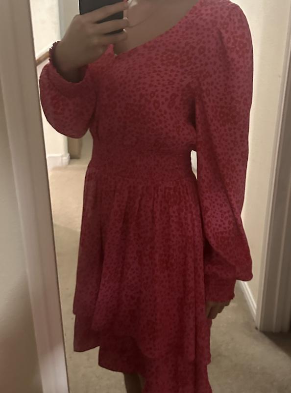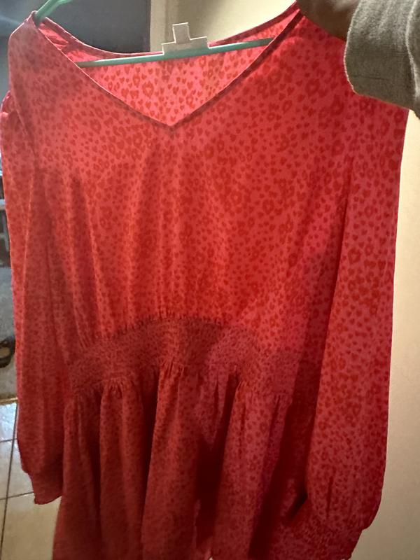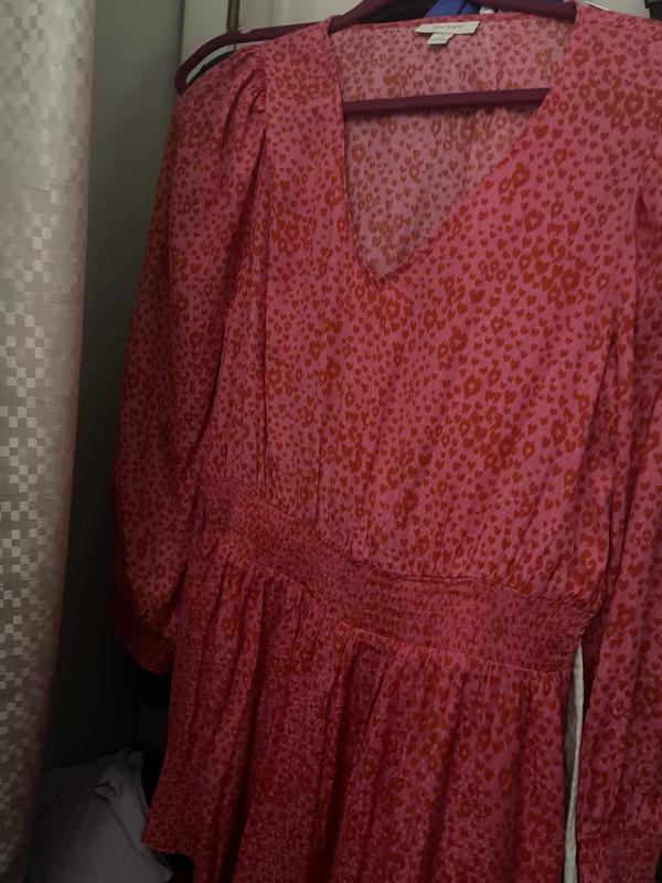 This dress is flattering, fits well, cute pattern, fun and great with a short pair of boots.