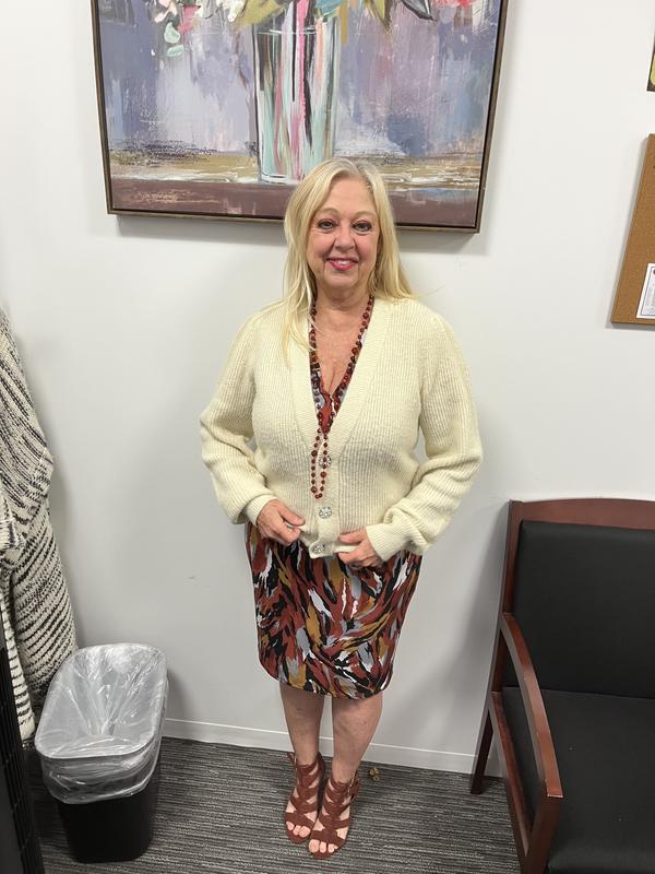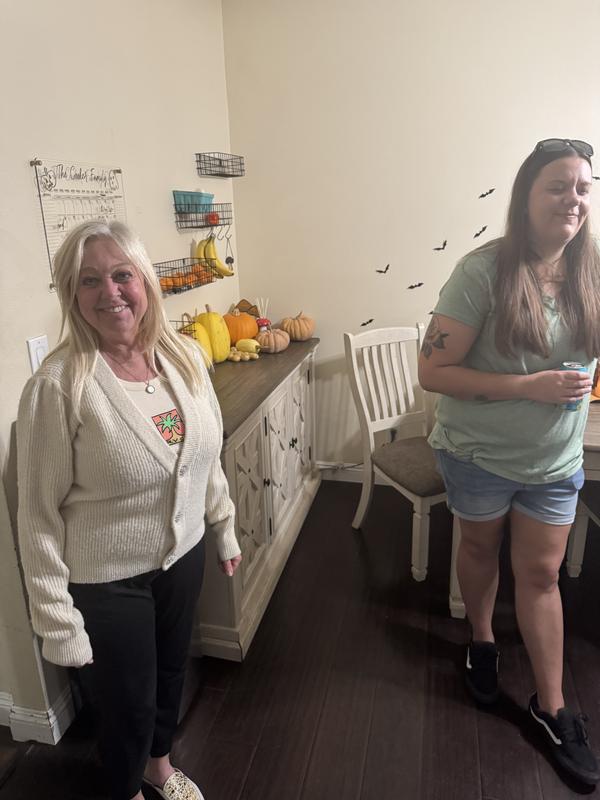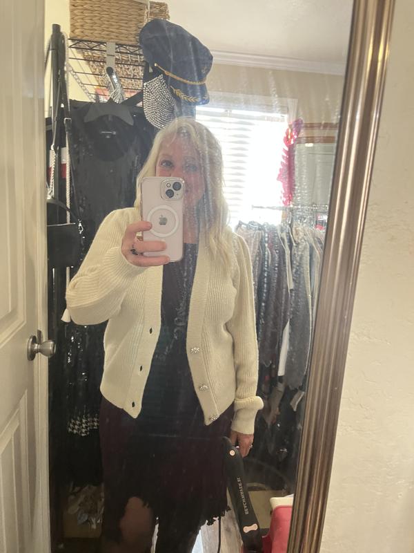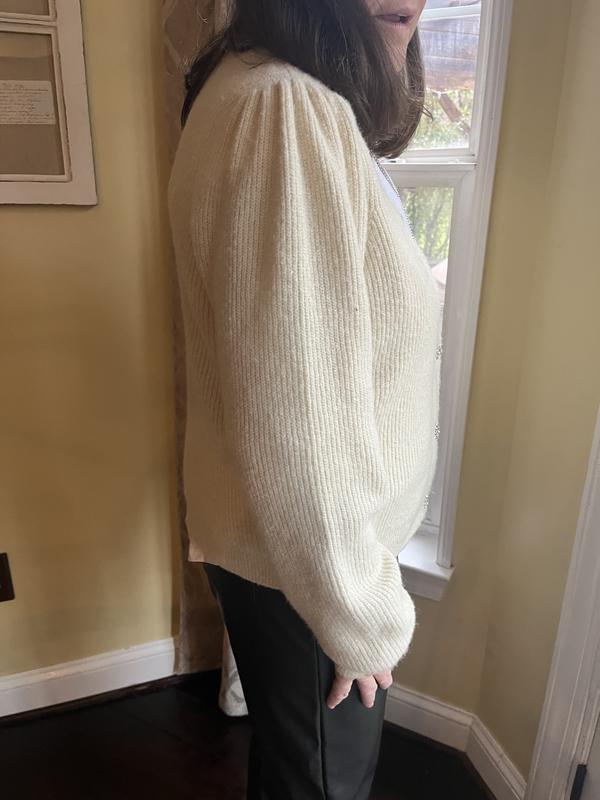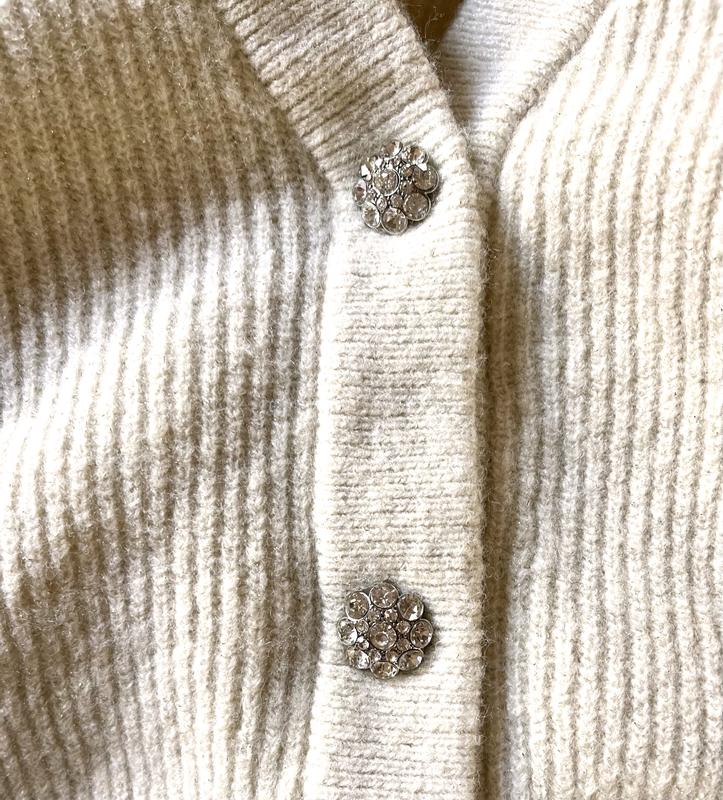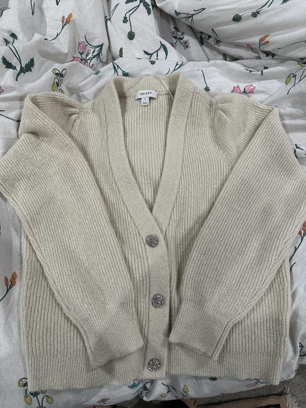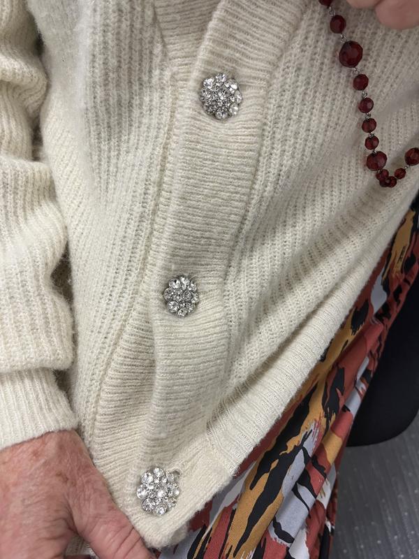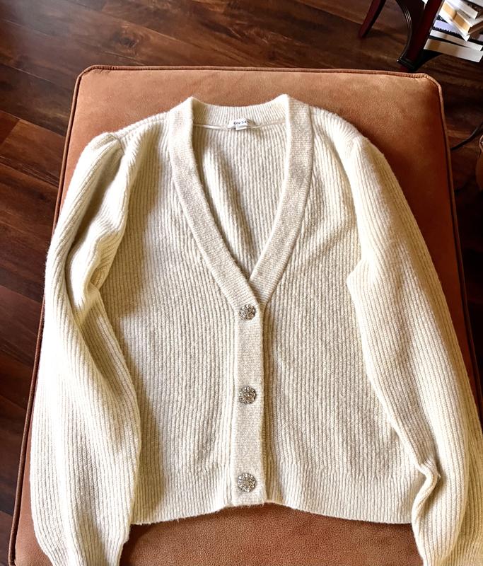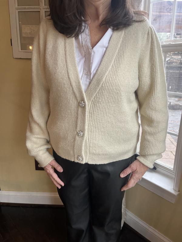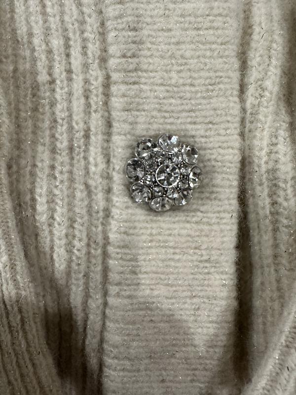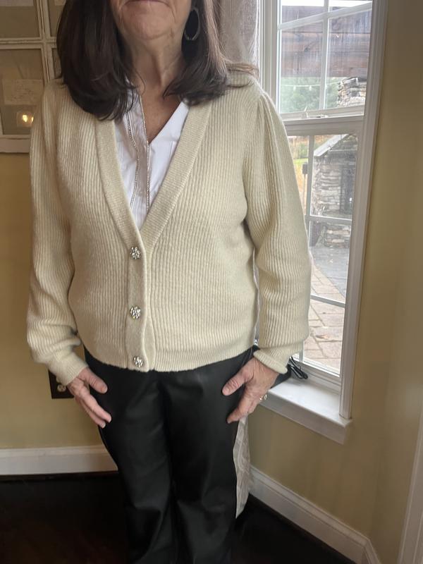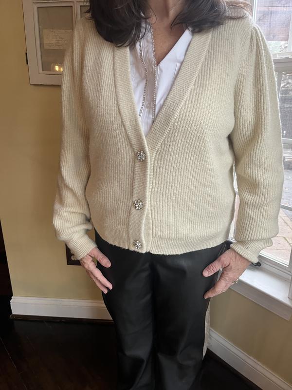 Beautiful, comfortable cardigan. It is very cozy . Love the rinestone buttons!