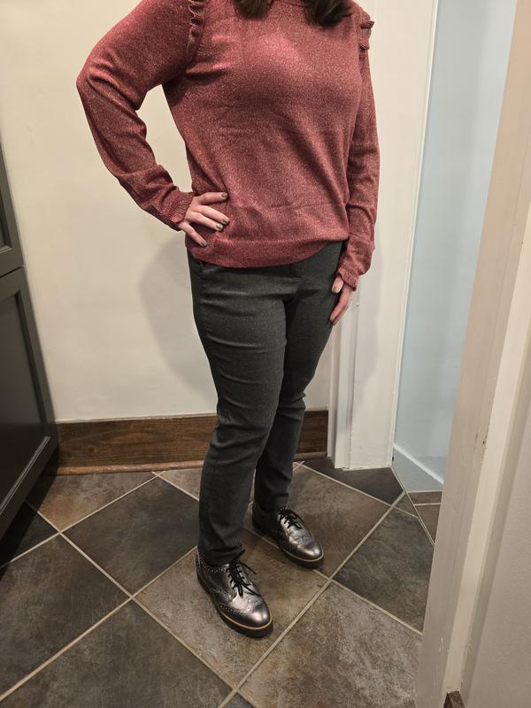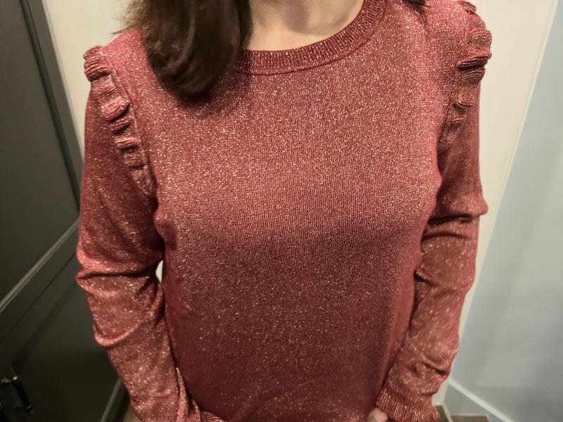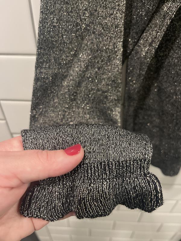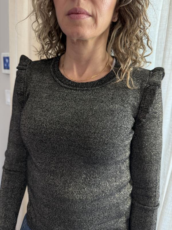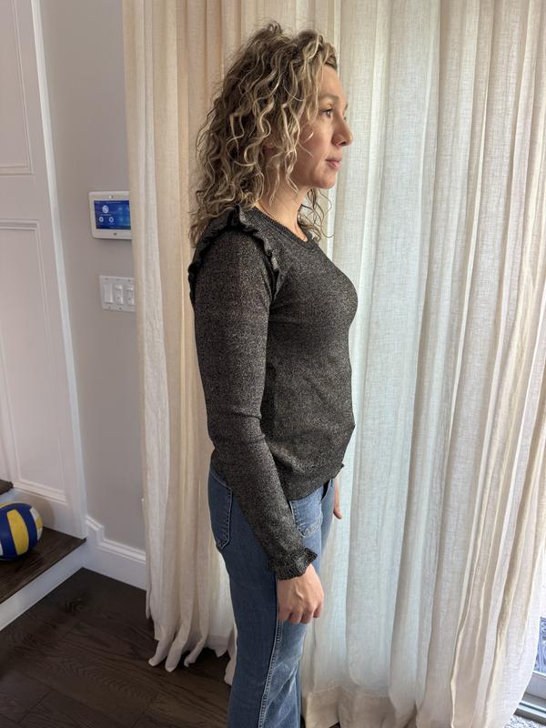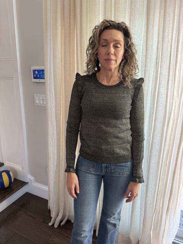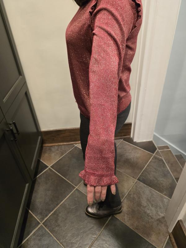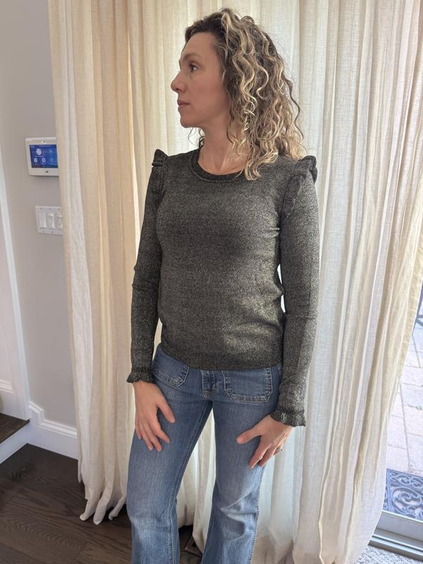 I love the ruffle trim where the sleeves are attached. The subtle, sparkly soft knit is comfortable and perfect for a casual lunch with jeans, or for a party. I loved the rhubarb so much that I bought the black, too! I’m busty so the medium was a bit too tight and I opted got the large. Perfect!