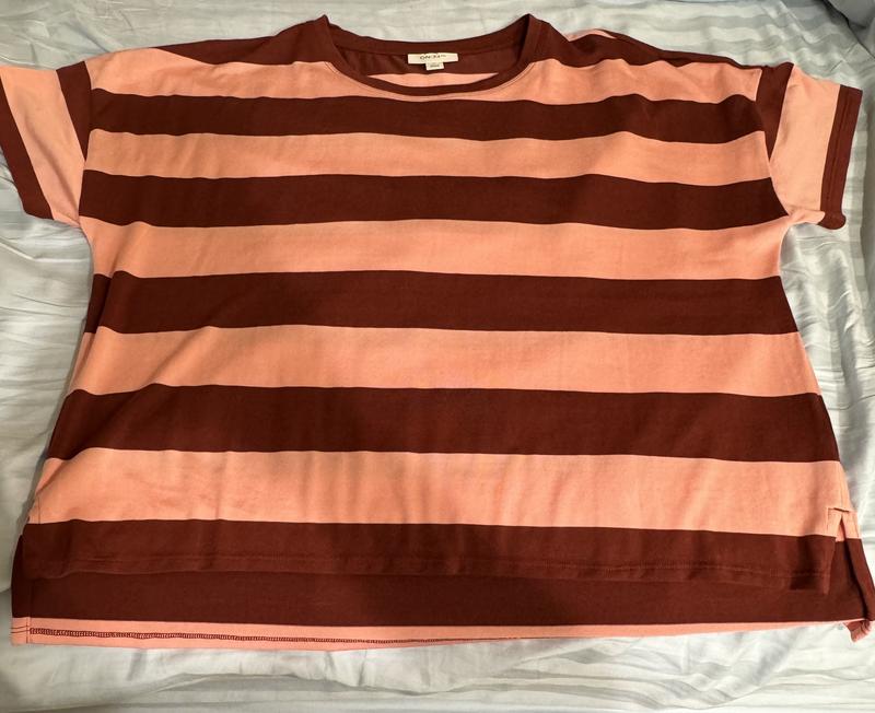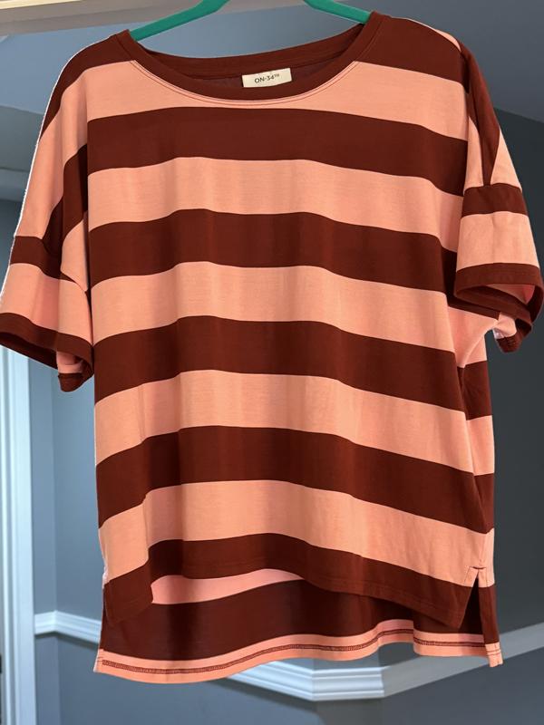 Genuinely nice fabric. I love the no wrinkles, dressier than a cotton T look. Fit is true to size, more of a relaxed classic fit. It looks cute with a tuck in the front look. I would give it 5 stars, but I didn't like the color combination of pink and burgundy with my warm skin/hair tone. I think it would be better with cool tones. Still, a great look and very versatile!