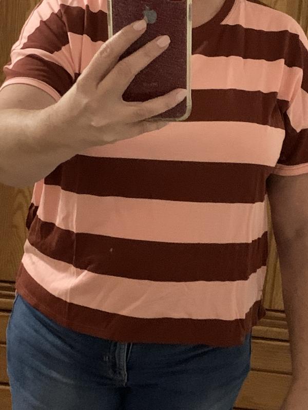 This rugby look top is sporty and casual. I am tall so it probably is a little boxy and short for me. Overall I like the feel of the soft cotton and light weight of the material. I will wear with khaki or denim.