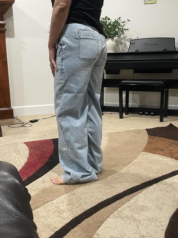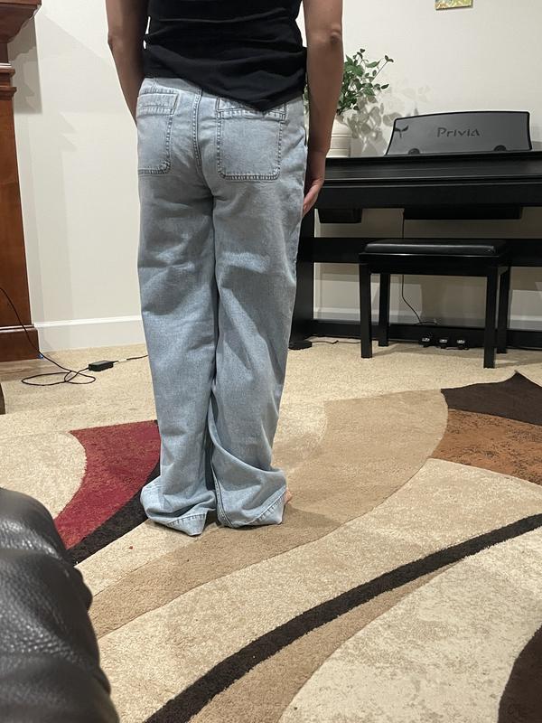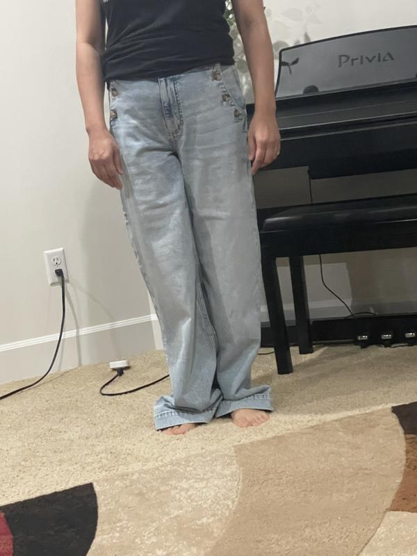 I love the color, and they fit perfect. Unlike most of the new wide jeans, these were not hanging past my shoes. Actually, they hit the top of my shoes, and I am 5.4 inches