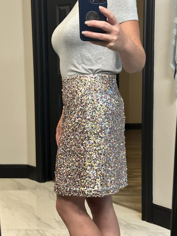 The fit of this skirt is a bit strange. The fit is snug at the waist but cut fuller through the hip and leg. I will need a shapewear bodysuit to smooth out beneath it due to the seams being higher profile than the rest of the skirt. Not my favorite fitting fall evening piece, but the fun reflective colors are eye-catching.
