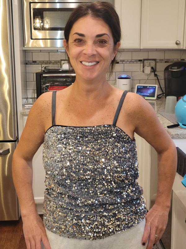 Bought this top in two colors. I don't have a model's body, so I plan on wearing casually under a cardigan. I'm a full figured size Large, and the L fits perfectly. The sequins aren't scratchy.