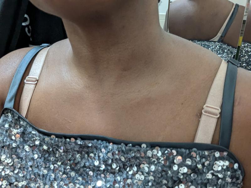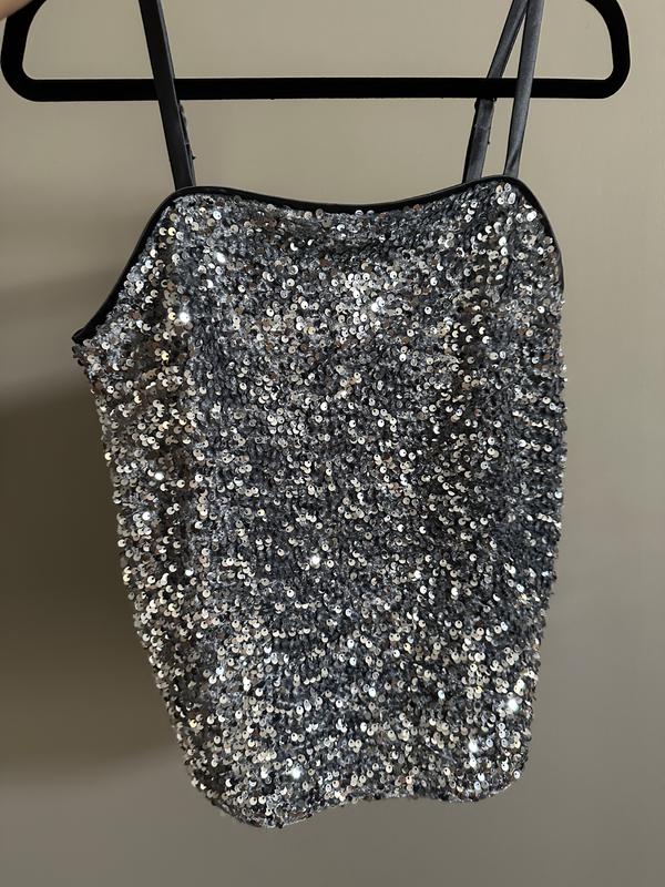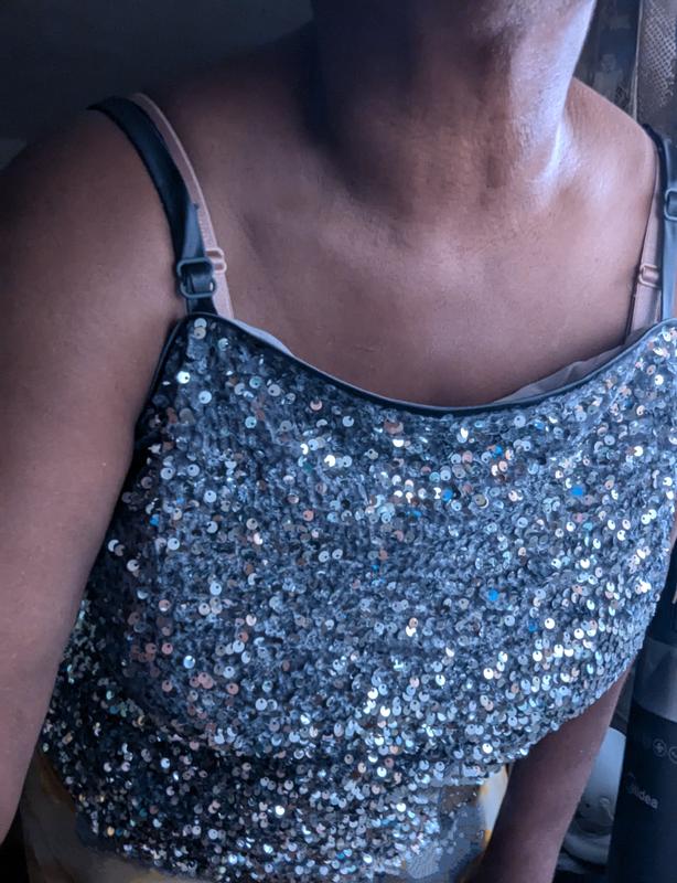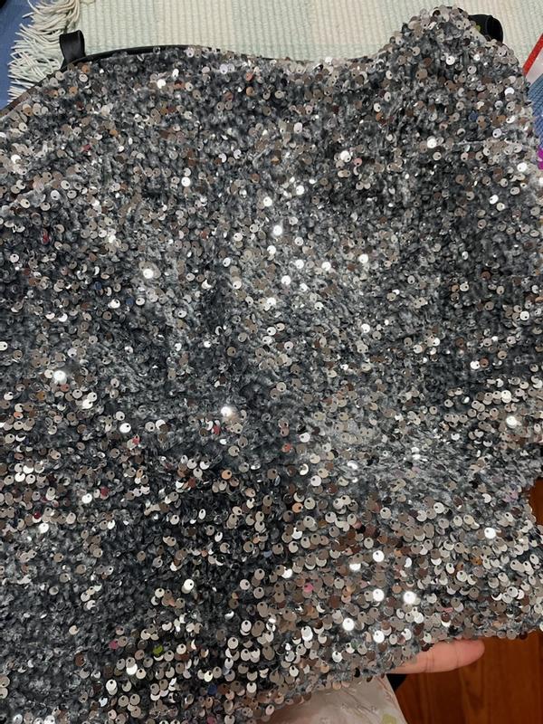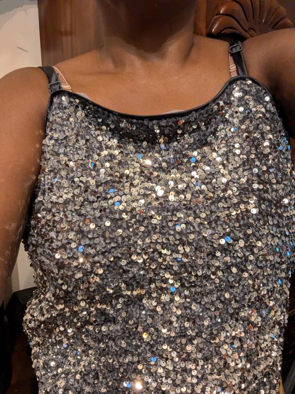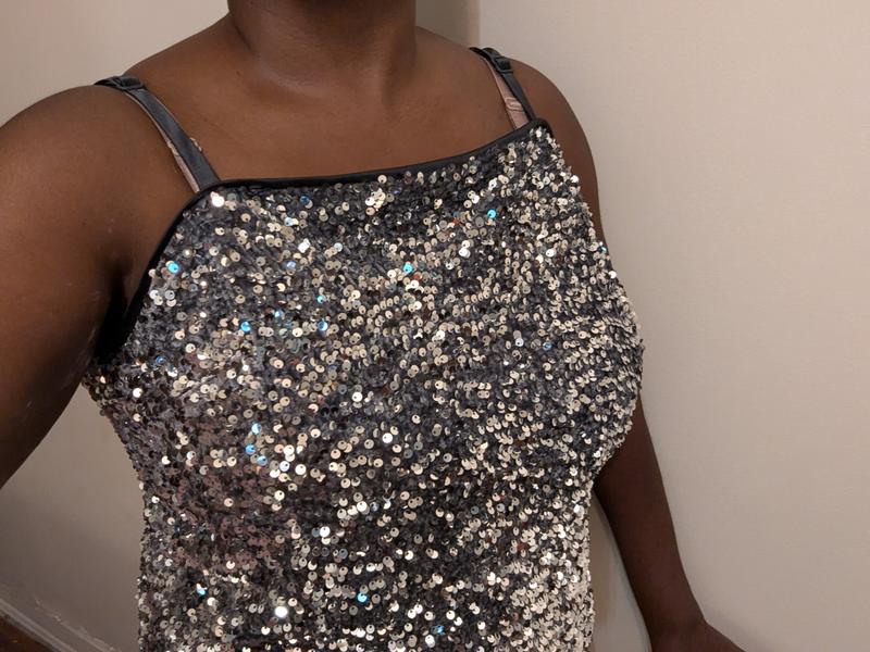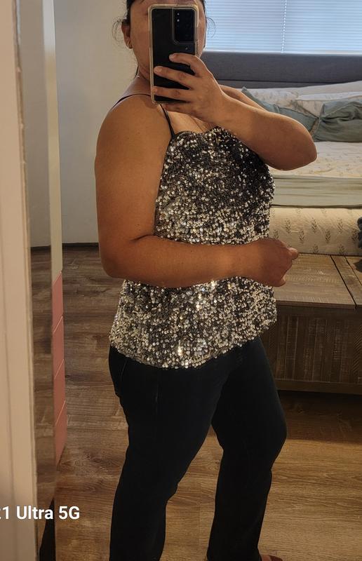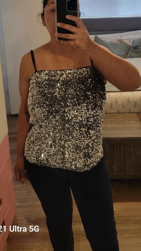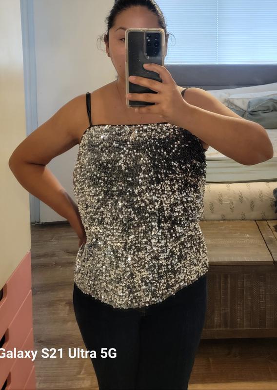 This top is super cute. The sequins really sparkle in the light. The top is a looser fit and not form fitting. It’s very flattering for all body types. The neck line doesn’t show any cleavage. My only issue is that the sequins under the arms irritate the skin a little bit. I think if you’re out for a long night it might be uncomfortable by the end. Definitely a good New Years Eve top!!