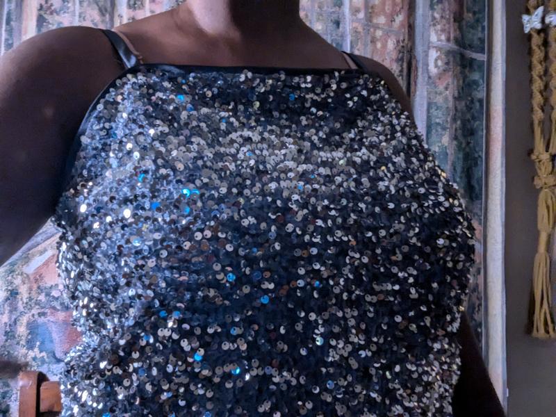 It's very sparkly! Just what I need for a party. It is soft and easy to wear. It also hides my stomach too.