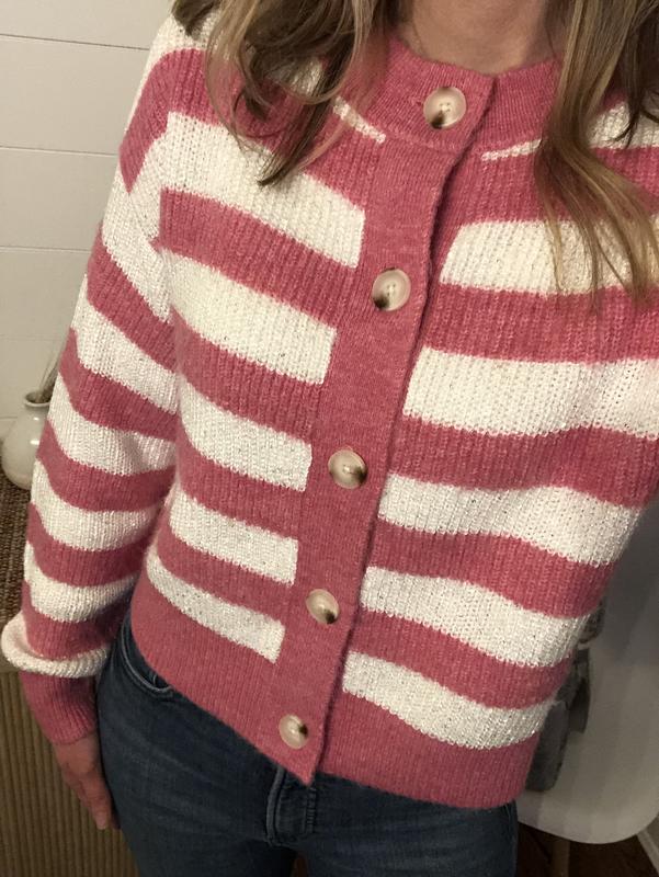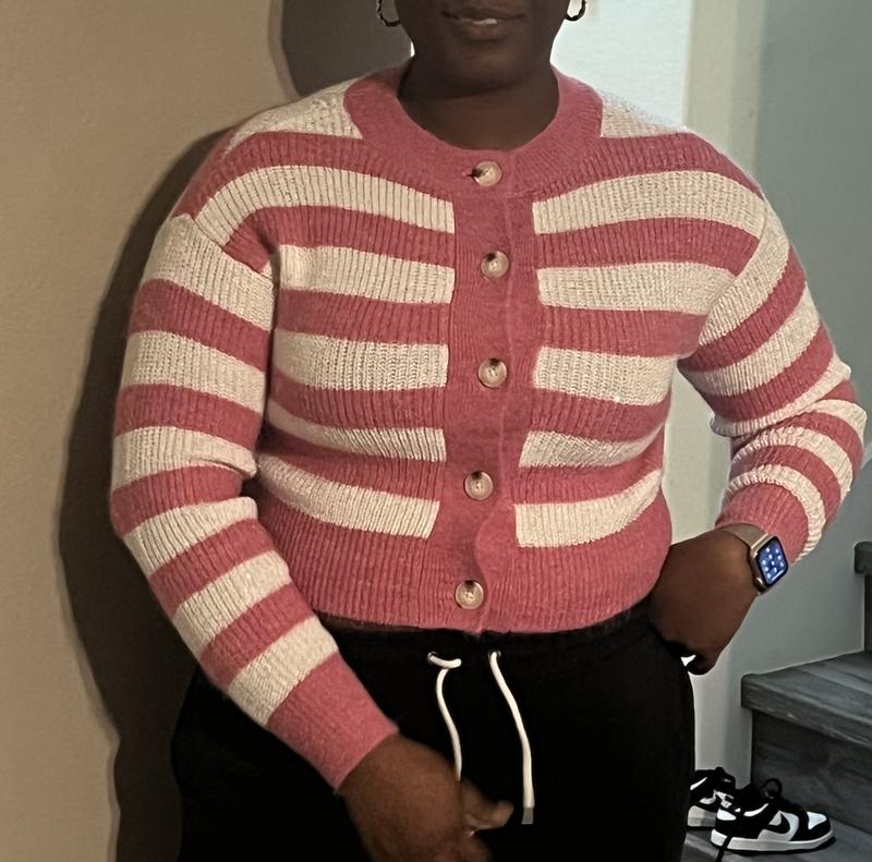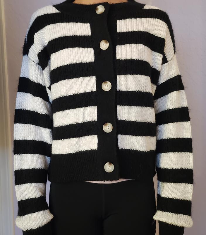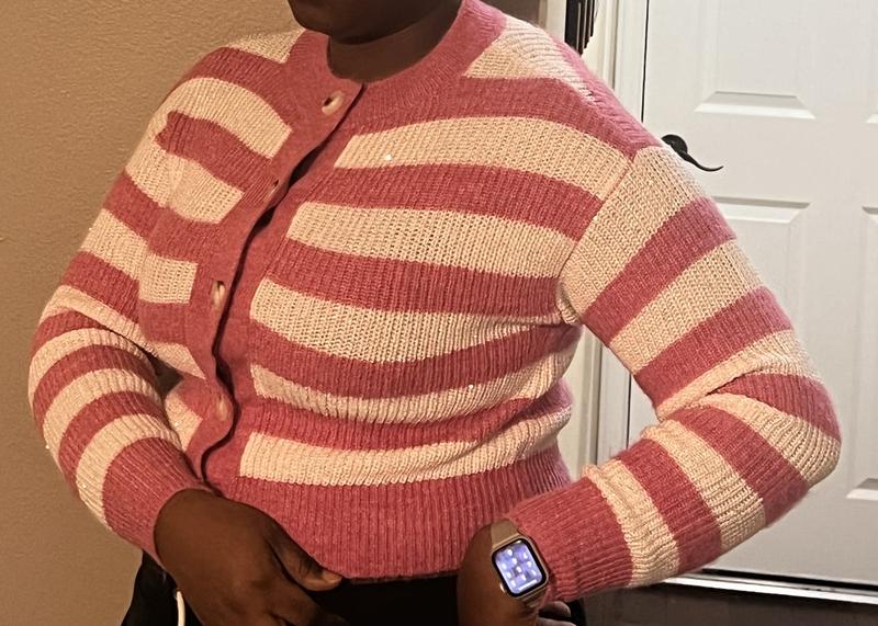 Sweater is nicely made, but for me the stripes were way too wide. And, the sweater was way oversized in the body and the arms. Did like that it was a little cropped, but still too large for a petite frame. Had to return it.