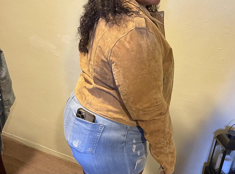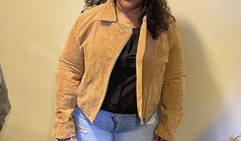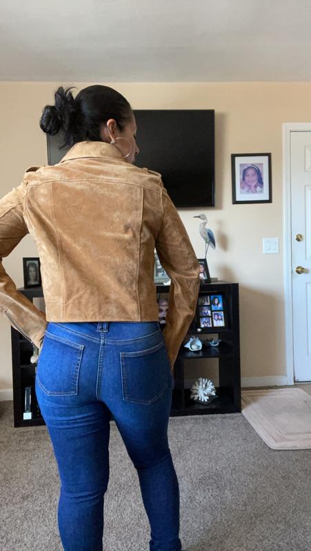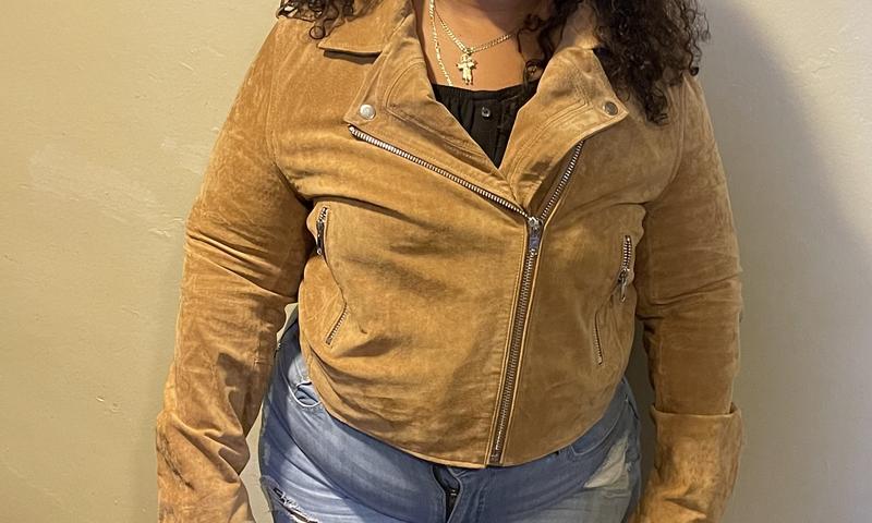 Beautiful blue suede. I will say the sleeves were too long but my tailor can work with almost anything. He also commented on the beautiful fabric and was able to shorten the sleeves even though it has zippers. Now the jacket is perfect. Your mileage may vary if you don’t have a tailor.