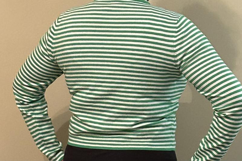 This is a nicely finished acrylic cardigan - the white trim at neckline and front as well as sparkly buttons make it easy to dress up or down. It is a good fit with moderate room in the sleeves to go over a dress with sleeves and not skin tight. I thought that it would be a shorter length but it is really cropped - more like a shrug than a cardigan. I only had a drawing to look at when I ordered it - photos with a model wearing it show the length better. Great if you are looking for a sweater to wear over a dress but it would sit well above waistline and gap over all but the most high-waisted pants.