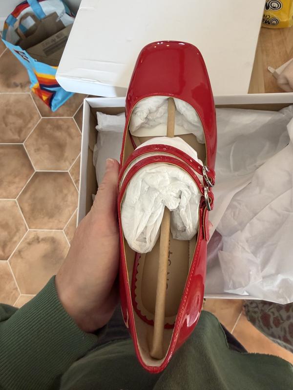Gorgeous shiny red heels, with adorable straps. Perfect for the holidays or a summer night out. I adore the square toe on these, and how they shine! The shoe feels a bit stiff so it will take a few wears to break in. True to size! Would definitely recommend!