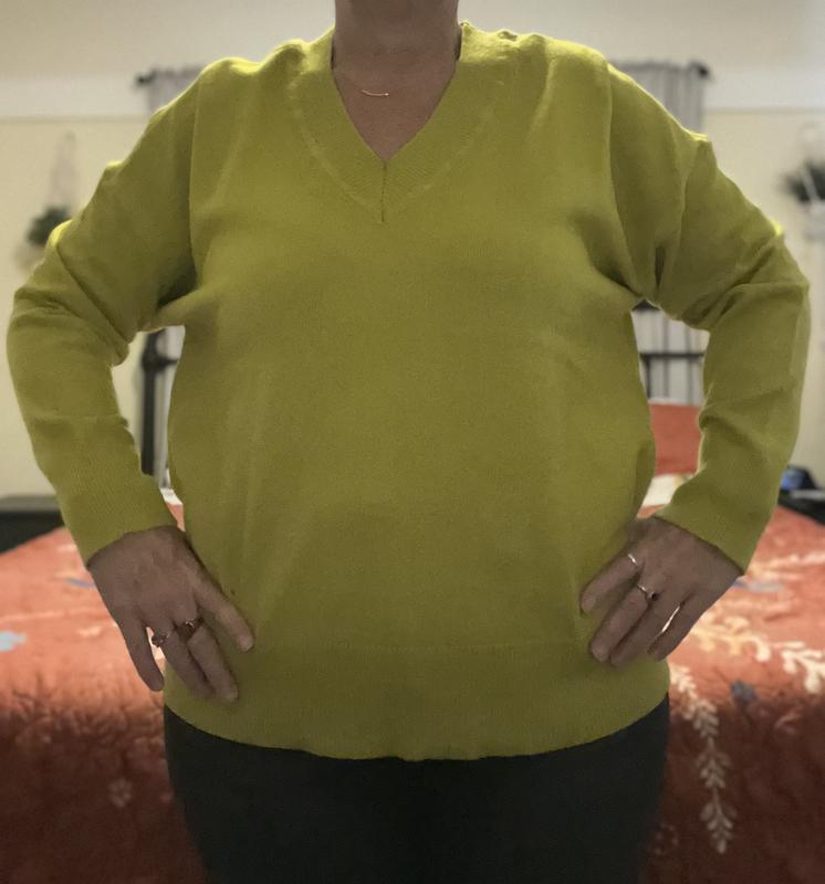 It is a green color sweater - not yellow. Great layering sweater.