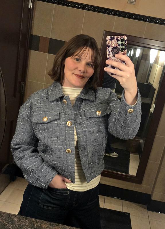 Looks really nice and dresses up any outfit. Gold buttons and blue color look great Flattering fit.