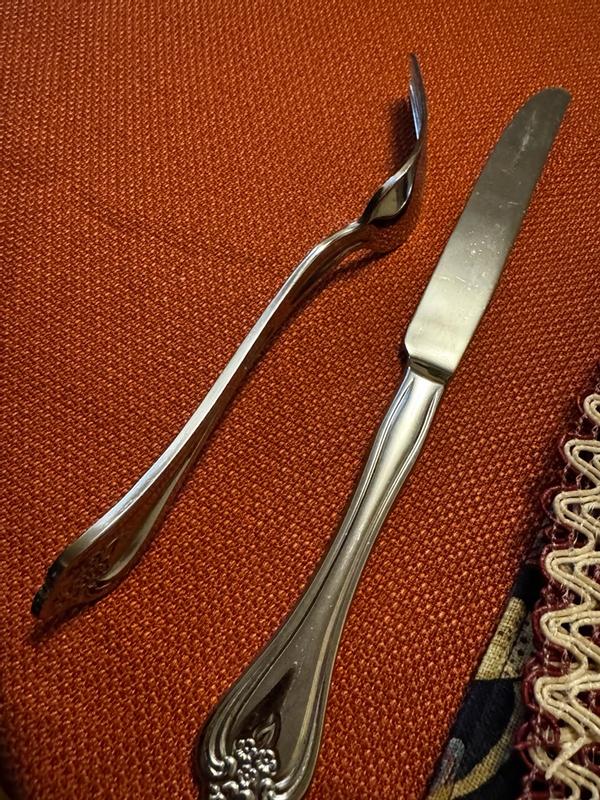 These are beautiful! They have a great weight to them, they definitely don’t feel cheap. And they’re so shiny. I also love the little flower details on them as well. The forks do have a curve to them, more than others I’ve had, but it didn’t bother me when eating with them. They clean really nicely as well. I use a microfiber towel to dry them and they were shiny and new again. I will be getting more to add to my collection.