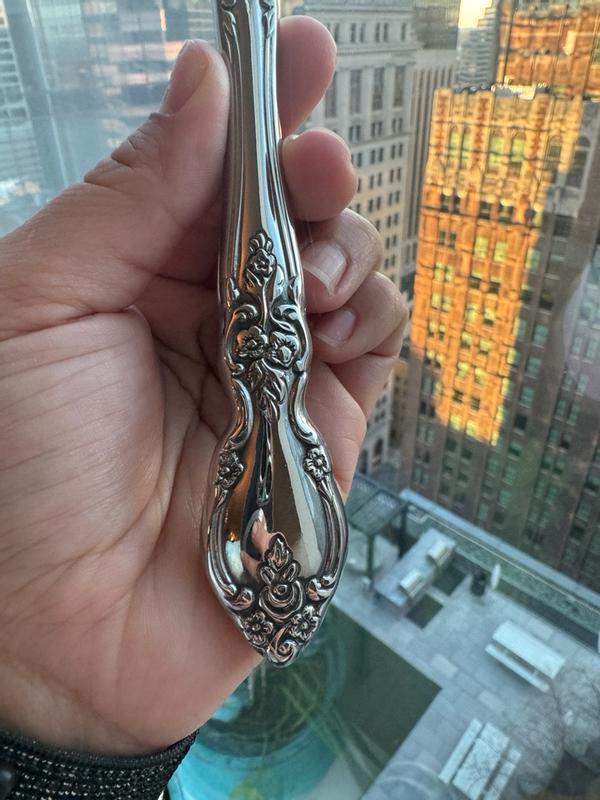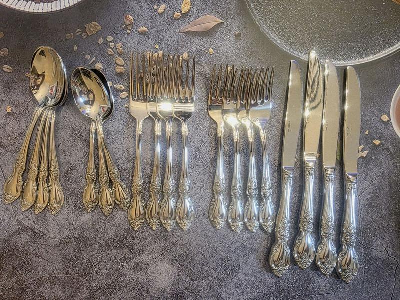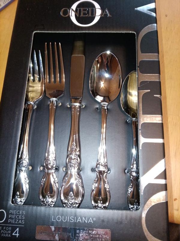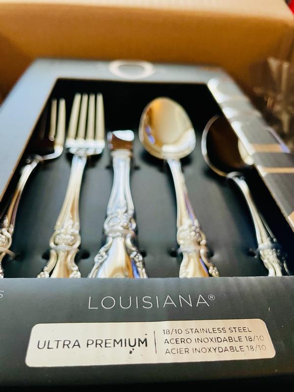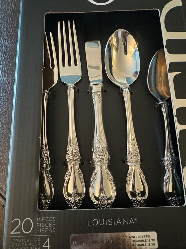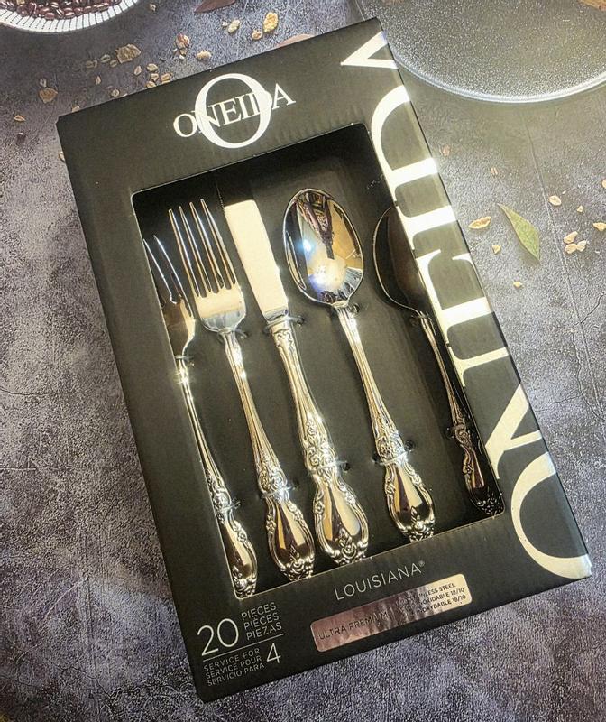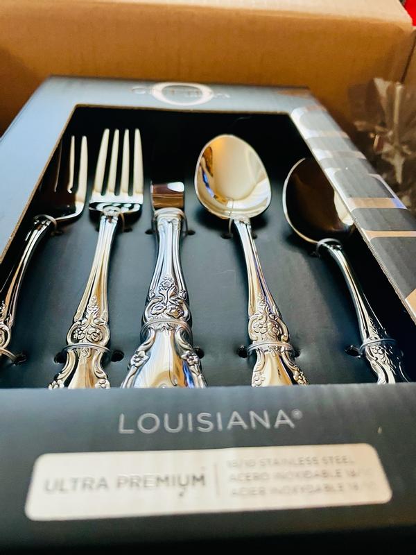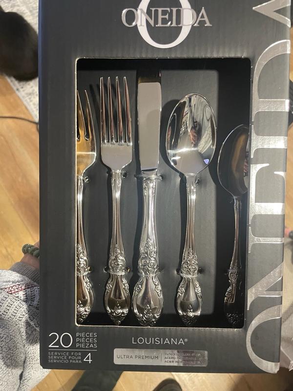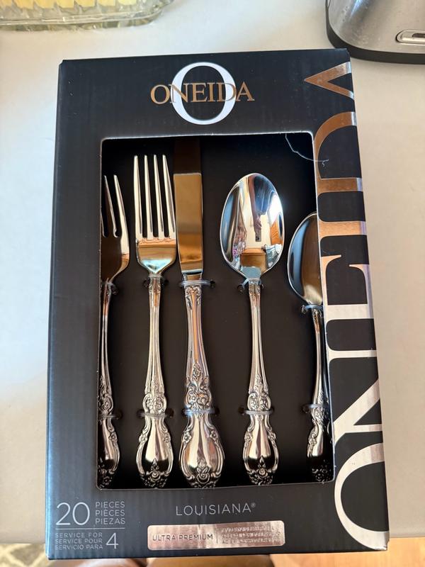 “How do I love thee? Let me count the ways.” This Oneida Louisiana 20 Piece Fine Flatware Set is the best set of flatware I’ve ever owned. When searching through various sets online I considered the weight/thickness of the stem, tine length, the size and shape of the bowl of the spoon, and the thickness of the neck. I’m no silverware expert, these are simply the visual cues I used to determine which set might work best for me. Since I selected the set online I had to decide what looked like it would give me the feel and experience I desired. This Louisiana set is everything I wanted and needed. The design, pattern, and mirror finish are beautiful and will create an excellent presentation on any table. I also believe this set can complement any plate setting. The weight is just right and each piece feels durable. The possible longevity of this set excites me because I’ve read of several individuals owning their Louisiana sets for years, even decades. I promise I had no idea I could get excited about using a spoon or fork for breakfast or dinner. This is my reality now. Holding these utensils and using this fork is a far more comfortable experience than it was with my previous set which had a thin handle. I didn’t realize what a positive experience new, beautiful, expertly crafted flatware would have on my dining experience. The knives have a sturdy handle with significant weight at the back of the handle and the teeth are nice and prominent for cutting into vegetables and various delicious dishes. While this set is dishwasher safe, I’ve been following a recommendation to hand-wash and immediately dry with a microfiber cloth. Let’s see how long I can keep up this practice which will help the pieces look their best longer. I’m looking forward to enjoying my next meal with my wonderful Louisiana flatware.