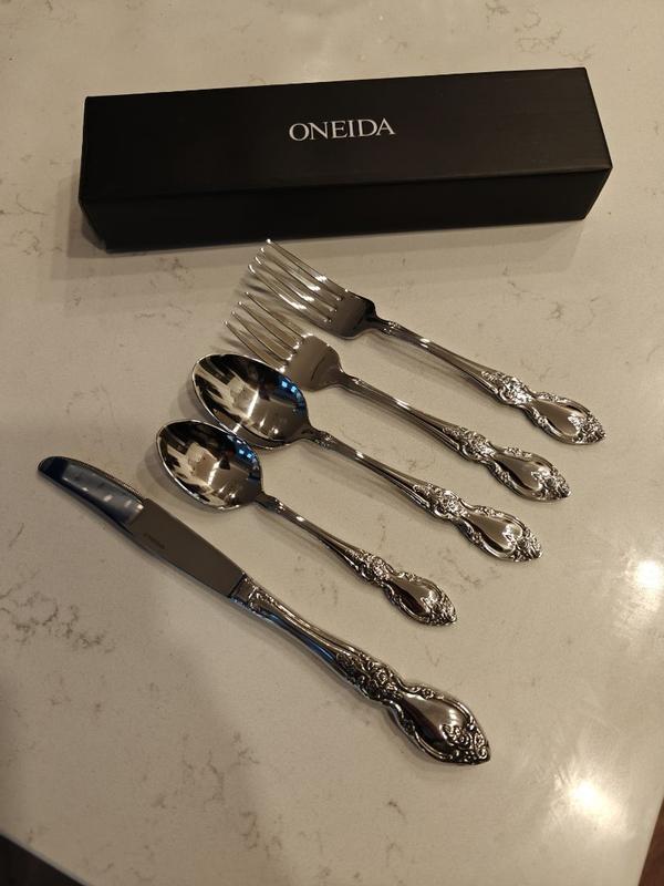 This is such a beautiful cutlery set from Oneida. The design on the handle is so elegant. I love the packaging of of the black box it came in. I haven’t had the chance to use them yet but they definitely look very durable. Each piece isn’t super heavy and feels very smooth.