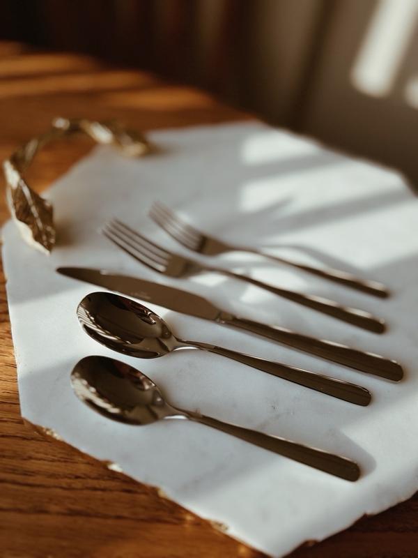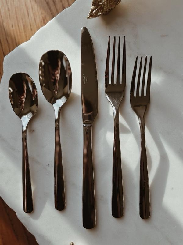I am very impressed with this cutlery set, I love how sleek they look and they are beautiful. My favorite is the shape of the spoons and the fact that 2 different sizes came in the set. They wash very well in the dishwasher and look practically brand new still despite several washes. They also speak to their quality because they survive the craziness that is my kids. I love this set!!