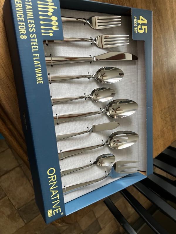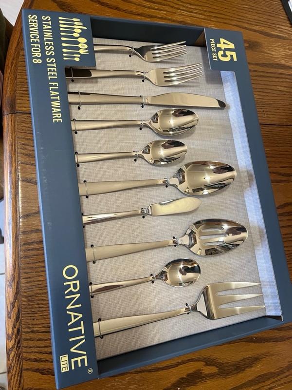 I received this Eloise 18/0 silver 45pc set for free for my honest review. I have used this silverware set for a month and have no complaints! I love that this is a full set - including serving utensils. It was a great addition to my kitchen, the subtle design of the hardware is beautiful in any place setting. And most importantly, they are beautiful and lightweight in hand.