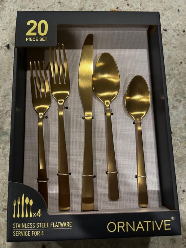 Obsessed with the Ornative 18/0 Stainless Steel 20-Piece Flatware Set in Matte Gold! It's the perfect blend of elegance and functionality. The matte gold finish adds a modern touch, and the well-crafted pieces are both durable and stylish. Easy to clean and versatile for everyday use or special occasions. Highly recommended for anyone looking to elevate their dining experience! ✨