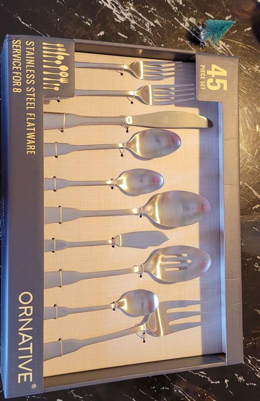 This 45 piece set is the perfect starter set for anyone setting up house or replacing that mismatched set. Service for eight and additional serving utensils are included. The matte finish is beautiful and the prices are weighted in such a way that they feel elegant without feeling too heavy. Wash easily and clean well, having no pesky grooves for food particles to get trapped. A must purchase!