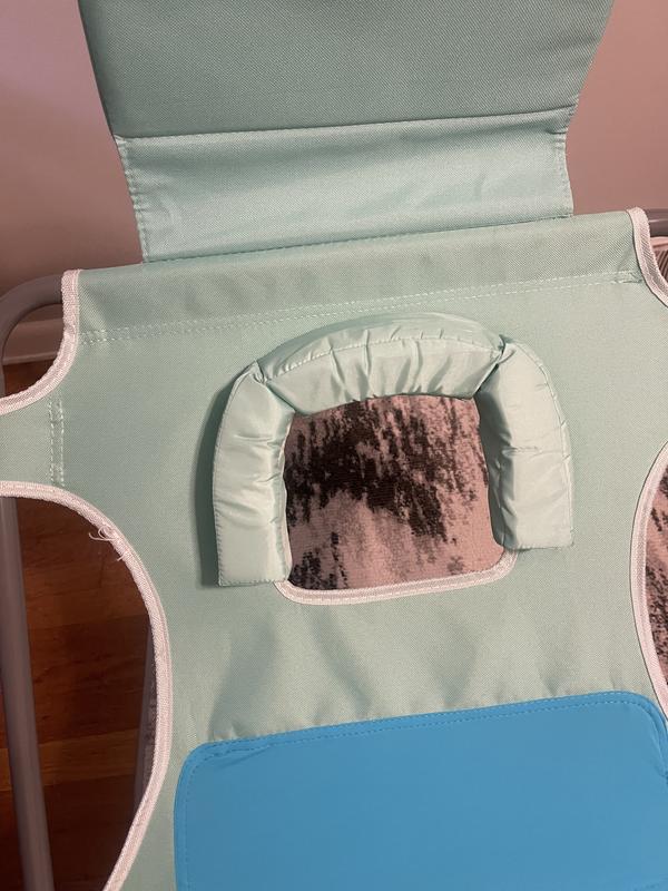 The chair really has all the bells and whistles. I love the face cutout so that your face doesn’t get squished when laying on your stomach. My arms didn’t have any issue with fitting through the holes but I have long and thinner arms. Make sure you pay extra attention to the set up instructions. It’s very important that you open up the legs first or the chair can collapse. It’s a very lightweight chair and it’s very easy to carry to and from the beach. You’ll get sand on it from your feet, but the material is slick so it’s easy to brush it off. The only complaint I have with the chair is if you want to adjust it after the initial set up, you have to kind of “reset” it by closing the top and then reopening it again and adjust it to where you want it. All in all it’s a fabulous chair and I look forward to using it at the beach all next summer!