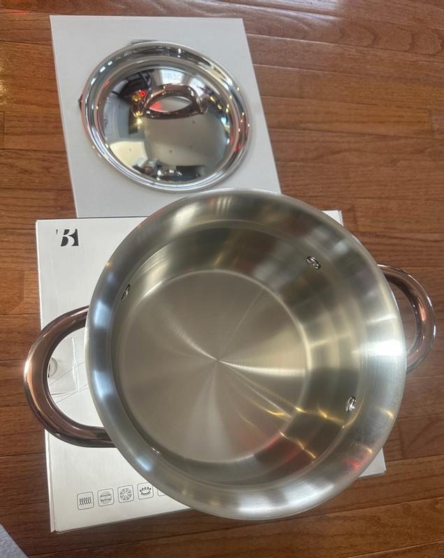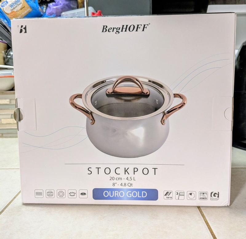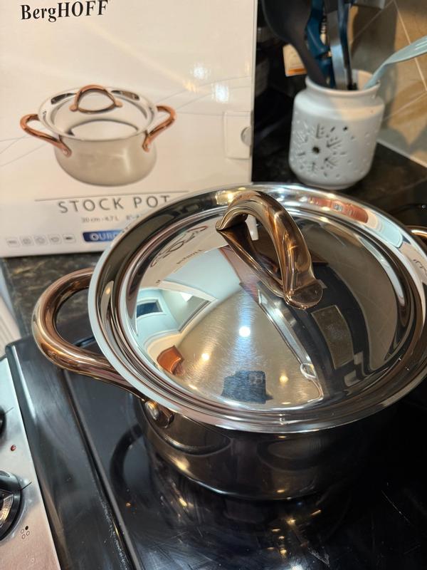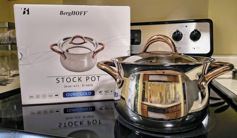 The BergHOFF Ouro Gold 18/20 Stainless Steel 8" Stockpot with matching Stainless Steel Lid (5 quart) is just beautiful! It's very sturdy and conducts heat evenly. The stockpot is nice and heavy, well-made, easy to clean, and has wonderfully tight-fitting lids. I'm thrilled with it. It's the perfect size for many of my cooking needs.