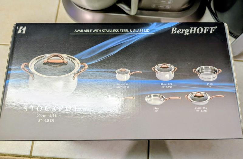 This BergHOFF Ouro Gold 18/10 Stainless steel 8” pot is very nice design with a high shine finish and rose gold handles and compact. The pot is not too heavy, this is a high quality pot and durable. I really like this pot that I can use it on electric, gas, Halogen, Vitro- Ceramic stove which is very convenient, and also the handles only get warm during cooking, not hot like other pots, making it very safety to use and great size for my family. It’s very easy to clean and easy to remove food residue. I love all the BergHOFF cookware, they are very durable and long lasting use and also, love my new kitchen toy