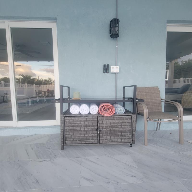 Outdoor Bar Cart Wicker Buffet Serving Cart with Cabinet and 8 Hooks