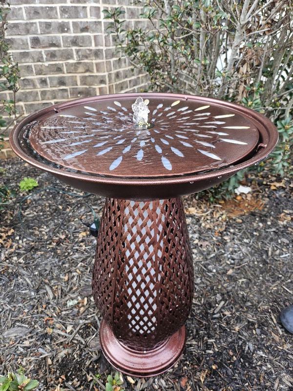 This is such a beautiful bird bath/water fountain and has added a great amount of ambiance to my front door area. I wished it had a longer cord so it could be placed in my garden area. I researched extension cords and electricians it was not advisable.