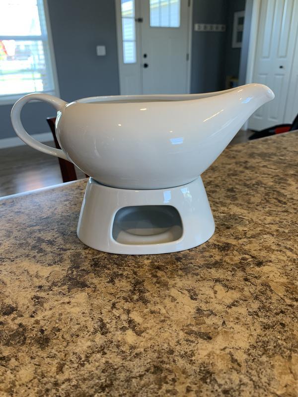 Great to have this for big dinners! The stand could be a little taller; the heat from the candle leaves a burnt spot in the bottom of the gravy boat. Fully ceramic, it washes off. Will put a piece of aluminum foil in between to help prevent that from happening. My DIL loved it so much, I gave the extra one to her. Great price for two!
