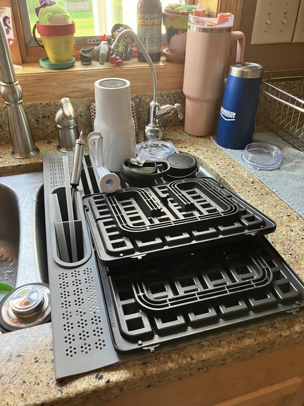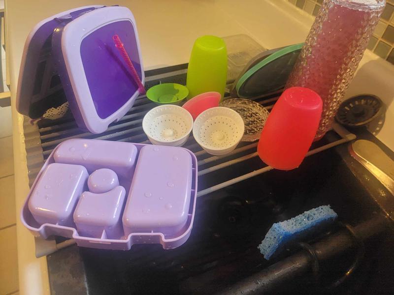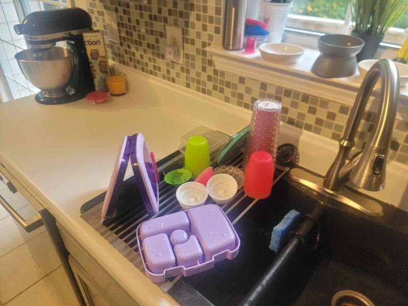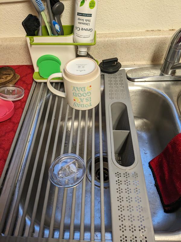 I can say with certainty that this is one of my favorite kitchen organization items. It saves space on my counter and lets me let dishes dry over the sink. I also like that it has a storage for your sponges. What makes it even better is that you can roll up the little rack if you need to access other parts of the sink And it takes up minimal space.