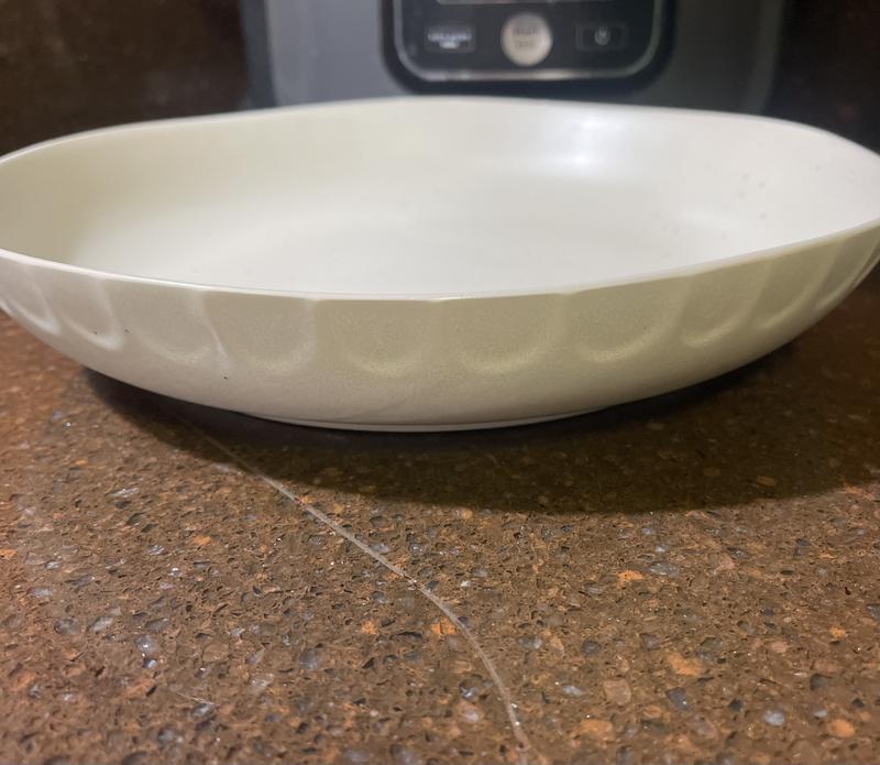 This serving bowl is absolutely beautiful, and it is versatile. We have used it to hold fruits for everyday use, as well as rolls, biscuits, salads, rice and pasta. The bowl is a lovely cream color and goes well with most décor. I like that it is made out of stoneware, and it is oven safe as well as dishwasher safe. I use silicone tongs and silicone spoons or wooden spoons when I am using stoneware in general, and I haven't seen any scratches on this bowl. The textured design also makes it easy to grip, especially when rinsing or washing with soapy water (if we choose to hand wash). It's a quality piece for our counter and we enjoy using it in various ways during our big family dinners. I will be looking for more pieces from this brand.