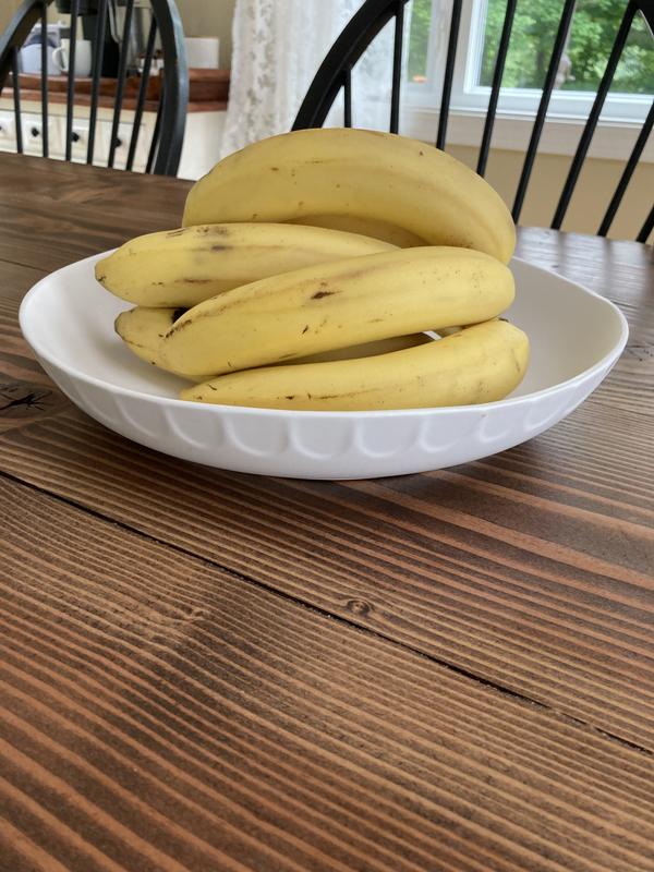This bowl is a great addition to my serve ware. It blends it so seamlessly, as the design is timeless and elegant. I included a photo with average size bananas, so you can see the size. The quality of the plate is evident from the texture and sufficient weight without being a brick. I look forward to using this for special occasions and sharing food with others!