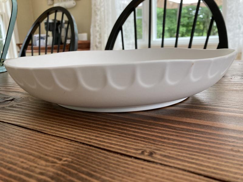 The McCausland serving bowl is beautiful and just the right size for my needs. It is low profile which is nice for using to proof my sourdough. It is also a perfect showpiece for the center of the diner table. I love the indentations along the edges as it gives the dish a handmade feel. The cream speckled color is lovely and matches everything. Finally it is a nice weight and feels very well made. I would buy more pieces to add to this set.