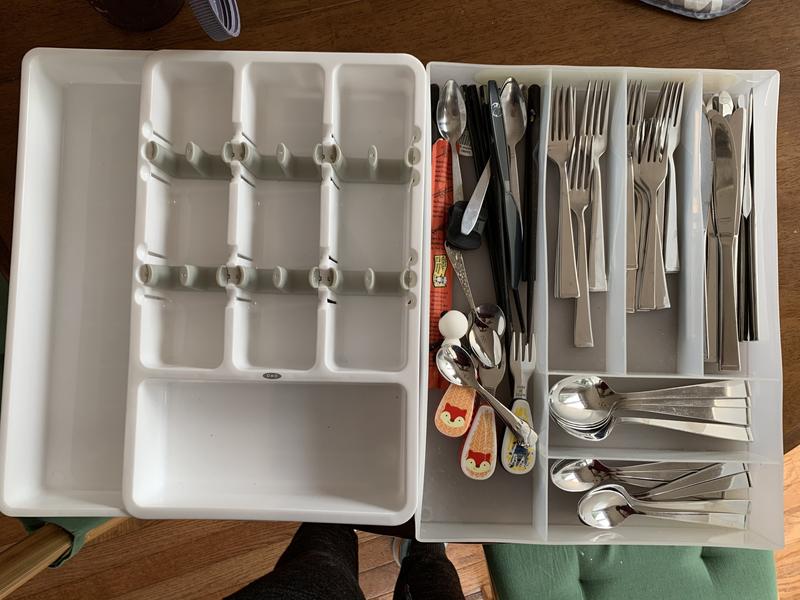 I am a great fan of OXO but this organizer is disappointing. The space for silverware is not conducive to getting your hand in to remove silverware and doesn’t fit some basic pieces. The expansion section is a great idea but it is awkward to open. The entire product is of a cheaper quality plastic. Not sure how this got the OXO name. I had already opened it and put it in my drawer so I guess I have to keep it.