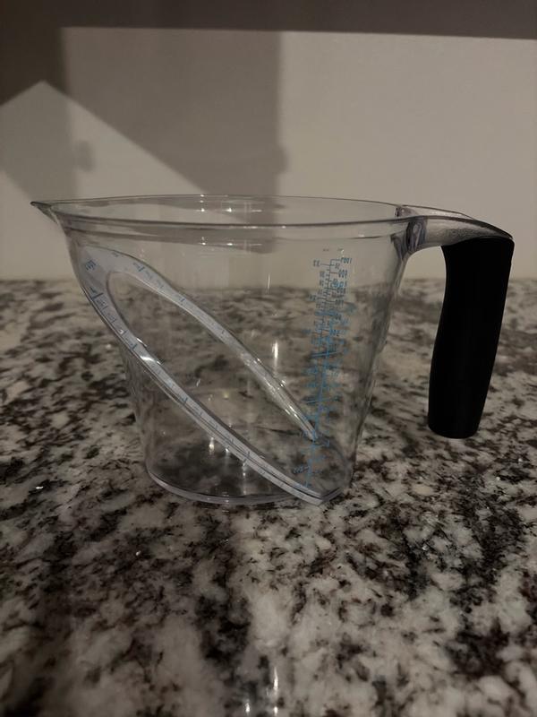 Innovative measuring cup with an angle! Very helpful for accurately measuring liquids! While I don’t love plastic material generally, it’s relatively easy to clean. It has a large capacity and is pretty light, too!