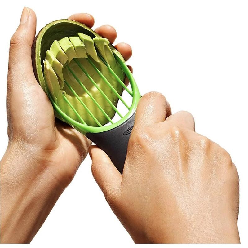 The OXO Good Grips 3-in-1 Avocado Slicer is a tool that can split, pit, and slice avocados. It has a stainless steel pitter that removes the pit with a quick twist. It also has a soft, comfortable non-slip grip.