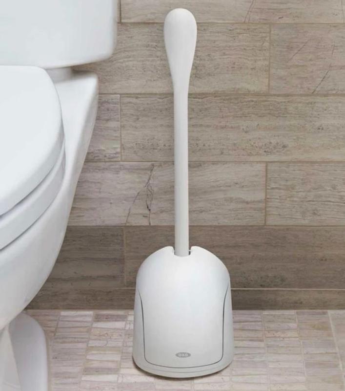 OXO Good Grips Compact Toilet Brush & Canister is Somali and space-saving,perfect for tight bathroom.It fits comfortably in the hand and the covered canister keeps it discrete and clean-looking. Firm bristles clean effectively under the rim and handles everyday toilet cleaning well.