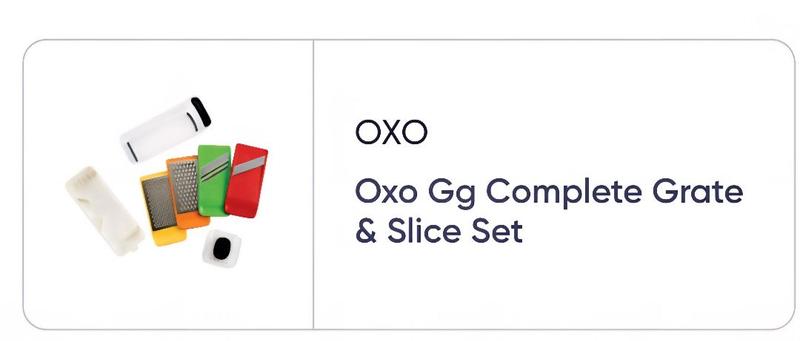 The OXO complete great and slice set are perfect for any thing I am fixing for dinner. It slices, my meat perfect every time. I also like to grate my cheese, so it is fresher than buying it already grated. These are all very easy to clean and safe.