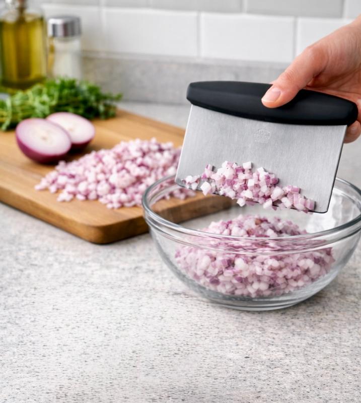 This kitchen tool has quickly become a staple in my cooking routine. It effortlessly chops through vegetables and herbs, making meal prep a breeze. The design is intuitive, and it feels comfortable in my hand while I work. Cleaning is also incredibly easy, saving time and effort in the kitchen. Overall, I highly recommend this handy chopper/scraper utensil for any home cook.