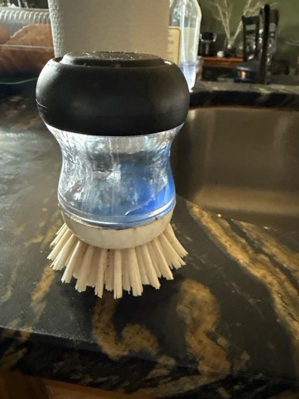 Oxo soap dispenser palm brush. Easy to use grips in your hand. I keep by sink so when I wash dishes I can use it to scrub them. I also use it to scrub sink to clean it. Top screws off allows you to add soap. Thick strong bristles on the brush want scratch dishes. Great for everyday use.
