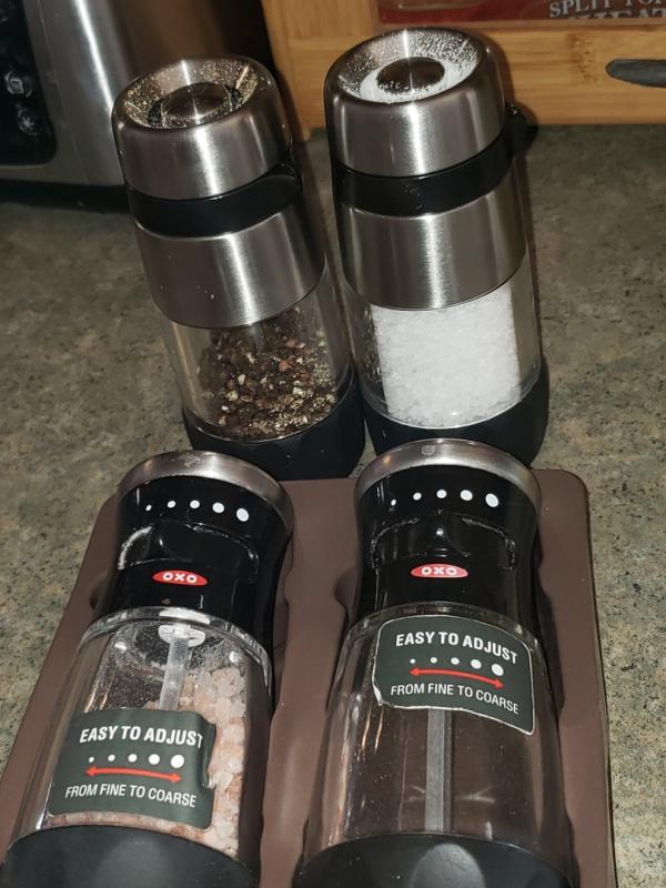 This OXO Salt and Pepper Shaker Grinder Set is so easy to use. There is more salt then pepper inside but still a lot for each one. They don’t take up a lot of counter space and the bottom stays clean as the salt and pepper comes out from the top. Easy to wipe clean.