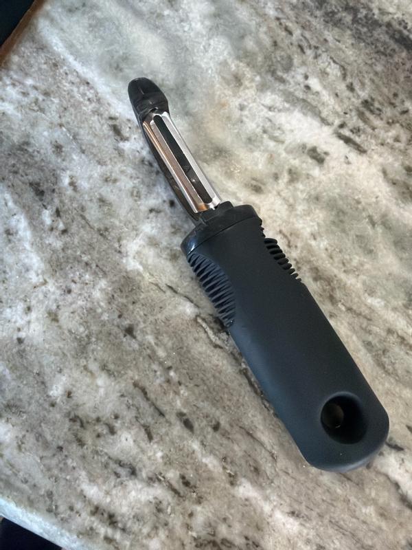 I love thos Oxo peeler! I have owned this one since about 2016 and it is still going strong. I love how thw handle feels as itnis soft on the hands yet hard enough to have a swivel action when you swipe. Others peelers I had were flimsy but Oxo is the one. Theybpast along time and it is still sharp and peeling all my potatoes and carrots. If this one breaks I will be buying this one again. The tip has a little scooper to remove the not so nice parts of a vegetable or fruit. Safe enough to use in different directions of motion. Worth it.