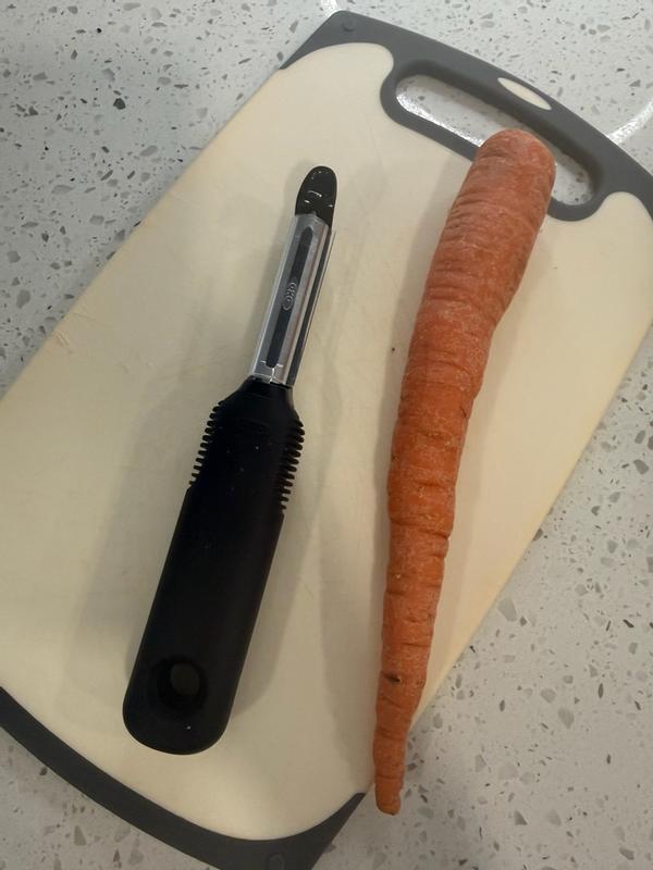 Review: The OXO Good Grips Swivel Peeler makes peeling fruits and vegetables quick and effortless. Its sharp, swiveling stainless steel blade follows the contours of produce easily, reducing hand fatigue. The comfortable non-slip handle offers a secure grip even when wet, and the built-in potato eye remover adds useful versatility. A simple, effective tool that feels durable and well-balanced in everyday kitchen tasks. Summary: Comfortable, efficient swivel peeler that handles produce with ease.